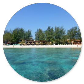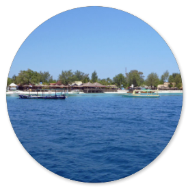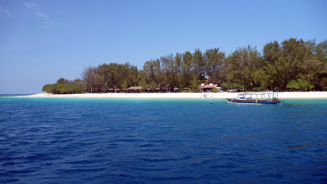 Nach gut einer Stunde Fahrt mit kräftigem Wellengang erscheinen vor uns die drei Inseln Gili Terawangan, Gili Meno und Gili Air.