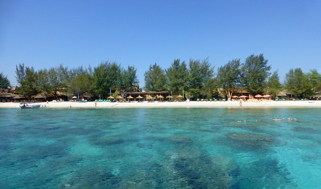 Gili Terawangan mag früher ein Geheimtipp gewesen sein, jetzt ist sie jedenfalls ziemlich überlaufen. Als wir (mit vielen anderen Booten übrigens) dort ankommen, sehe ich Hubschrauberrundflüge, Glasbottom Boats und viele Ausflügler außer den dort in Hotels wohnenden Gästen. Es erinnert mich stark an die Phi-Phi-Inseln in Thailand, die von allen Touristen als Ausflugsziel angesteuert werden. Als wir die Insel umrunden, entdecke ich einsame Hütten mit Individualtouristen, andererseits aber auch Hotels und Backpacker-Cafés mit regem Betrieb. Der Sand am Strand ist feinsandig und hell, das Wasser davor türkisgrün und sauber. Mein Bootsführer rät mir, hier zu schnorcheln, weil das Wasser klar sei und die anderen Touristen auch hier schnorchelten. Ich falle auf diesen Hinweis herein und finde ein total totes Korallenriff mit einigen winzigen Butterflies, Triggerfischen und Doktorfischen.