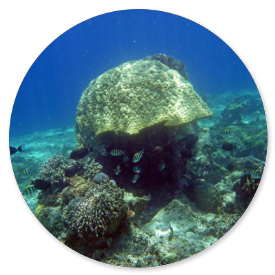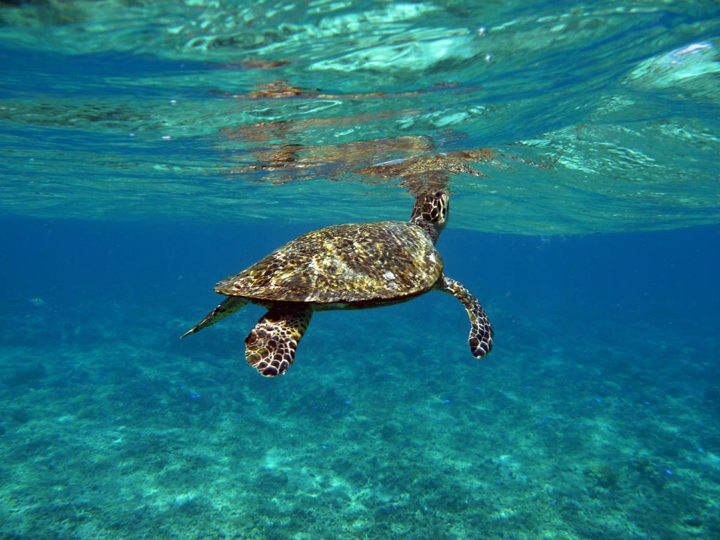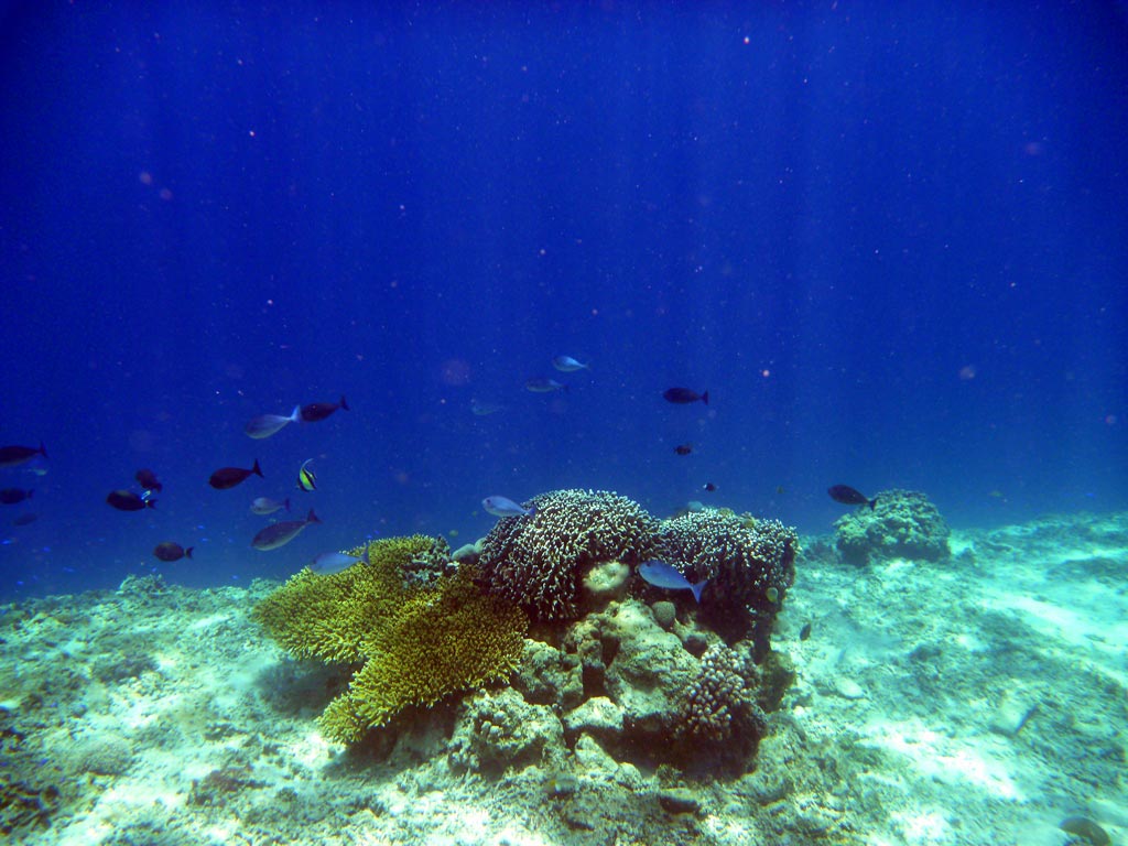 Daraufhin umrunden wir also die Insel Gili Meno und fahren zu diesem Riff. Er ankert dort und lässt mich am Riff entlang schnorcheln. Das ist schon besser: Ich kann Seeschildkröten beobachten, die seltene blaue Koralle untersuchen und viele Riff-Fische verfolgen, die zwischen dem flachen Ufer und dem tief abfallenden Meer umherschwimmen. Man kann durchaus 20 oder 30m tief sehen; das Wasser ist klar und ohne Schlieren. Das beeindruckt mich. Allerdings sind keine großen Fische zu sehen. Hier einige Bilder davon: