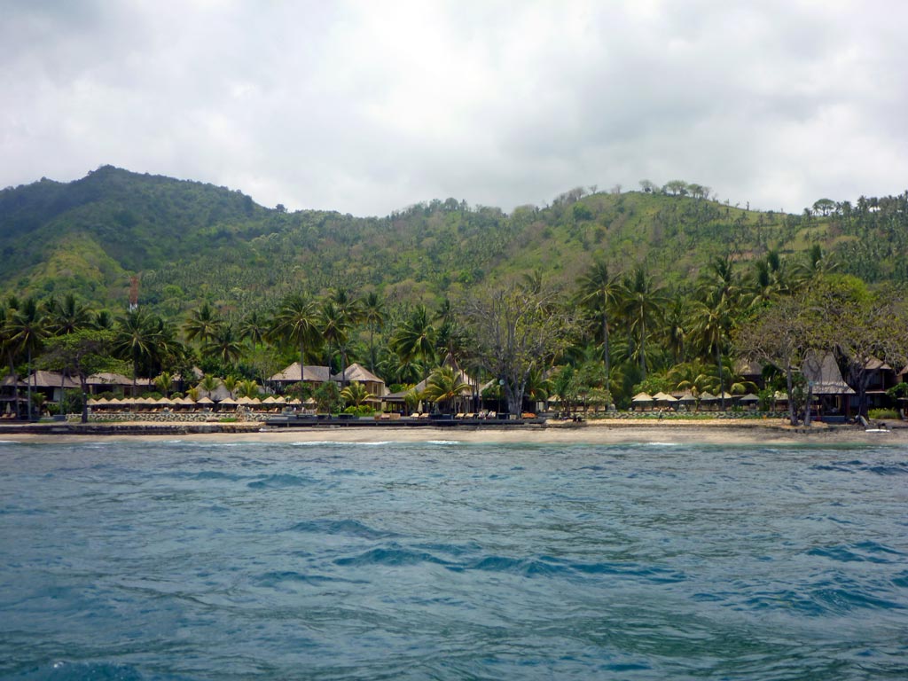 Das versuche ich heute auf den Gili Inseln zu finden. Tauchermaske, Flossen und Schnorchel habe ich von zu Hause mitgebracht. Gestern hatte ich mit einem Fischer verhandelt, der nicht weit von den Qunci Villas sein Boot an den Strand gezogen hatte. Für 500 000 (=32 €) Rupien kann man ihn und sein Boot für einen Tag mieten. Wenn man sich den Preis mit mehreren Personen teilt, kommt man ganz günstig zu den Gili Inseln. Inge wollte nicht mit, also sitze ich morgens um halb neun allein mit ihm im Boot. Englisch versteht er nur in Brocken, sodass die Unterhaltung sehr spärlich ausfällt. So schaue ich mir die Strände und den Küstenbereich an, der sich nördlich von Senggigi bis zu den Gilis erstreckt.