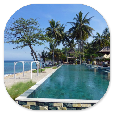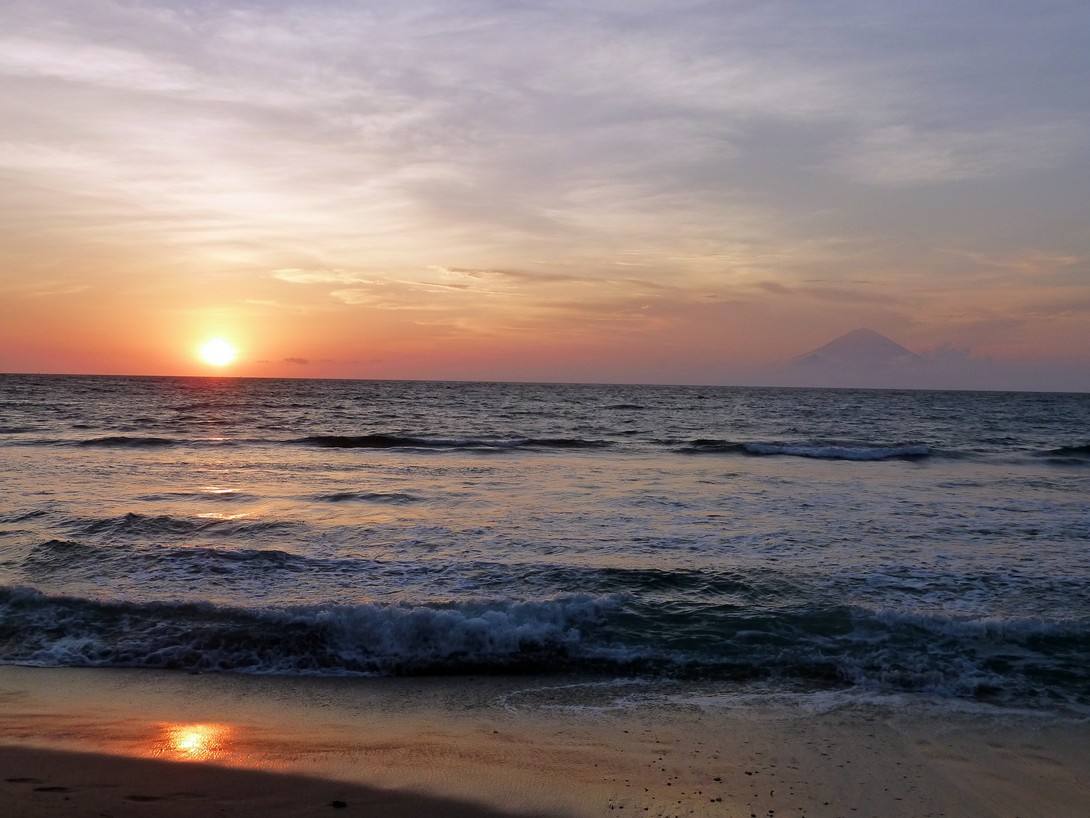 So sitzen wir bei der Happy Hour am Meer oder am Pool, schlürfen einen der leckeren Drinks zum halben Preis und schauen fasziniert übers Meer, wenn am Horizont die Sonne darin versinkt und der Gunung Agung (der 3100 m hohe heilige Vulkan auf Bali) in 35 km Entfernung als Silhouette erscheint.