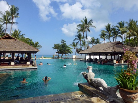 Die Luftaufnahme zeigt sehr gut die Anordnung der Wohnblöcke und die Lage des großen Pools in der Mitte. Obwohl die Anlage schon 26 Jahre alt ist, ist sie sehr gepflegt, etwas altertümlich, hat aber Charme und verdient durchaus ihre 5 Sterne. Allerdings vermissen wir den Blütenreichtum des Ayana Resorts. Bei unserem ersten Rundgang erscheint uns alles sehr ruhig und träge. Es ist windstill, heiß und überall liegen dickbäuchige Europäer, fette Russen oder ältere Leute auf den dick gepolsterten Liegen, von denen kaum eine frei ist. Alle scheinen schläfrig und antriebslos zu sein, am Strand macht keiner Sport, es ist keiner im Wasser, es ertönt keine Musik und man hört keine schreienden Kinder.