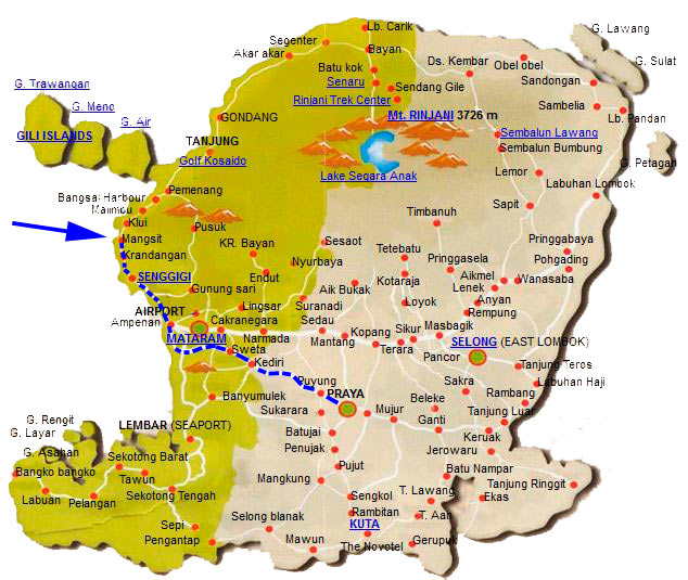 Beim Frühstück weiß schon die Serviererin, dass wir heute abreisen. Für 350 000 Rupien fährt uns der Hotelbus zum Flughafen. Eine Stunde später sind wir am Domestic Airport, wo es sehr wuselig und durcheinander vor sich geht. Wir haben aber Glück und sind die ersten am Schalter, als Garuda den Flug 436 nach Lombok aufruft. Als Ausreisegebühr müssen wir 40 000 Rupien bezahlen und landen nach einer Flugzeit von nur 28 Minuten in Lombok. Der Flughafen liegt südlich von Praya, der Hauptstadt von Lombok. Wir erkundigen uns in der Ankunftshalle nach Taxis; die Anbieter wollen alle 290 000 Rupien haben. Da wir die Taximafia kennen, lehnen wir das ab, worauf sie auf 250 000 Rupien heruntergehen. Das ist uns immer noch zu teuer und wir bekommen Recht: Am Ausgang stehen nämlich Taxifahrer, die uns für 200 000 Rupien zu den Qunci Villas fahren wollen. Wir brauchen für die 52 km weit mehr als eine Stunde und erkennen bei der Fahrt durch die Dörfer und auch durch Mataram, wie ländlich es doch im Gegensatz zu Bali ist.