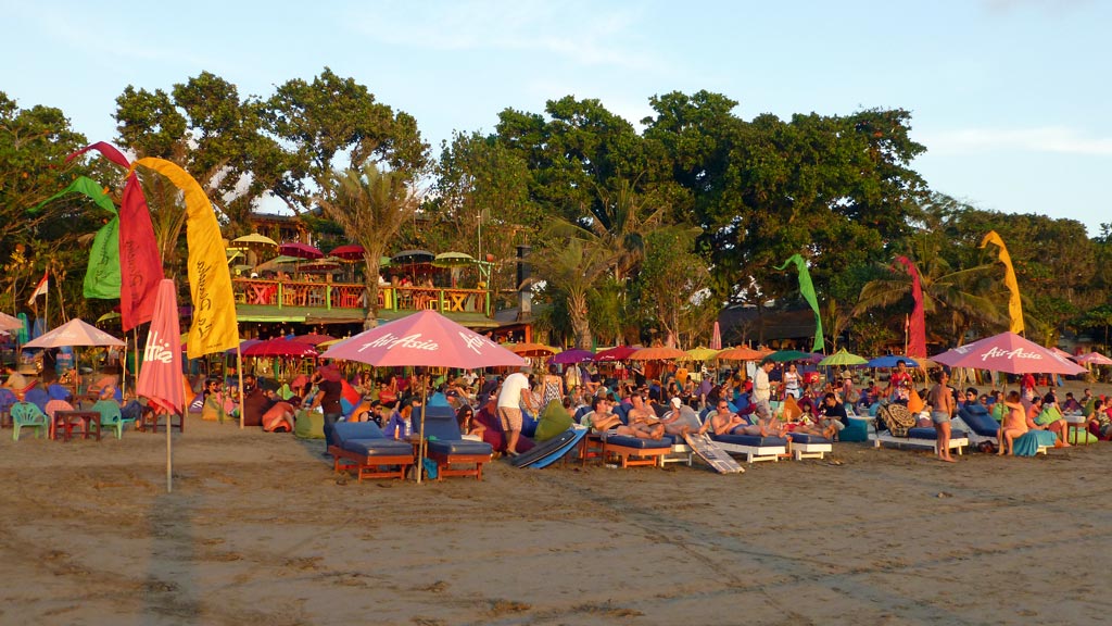 Vor dem Beachwalk befindet sich der sehr mäßige Strand, an dem man nicht schwimmen kann, weil er bei Ebbe bis zum Riff ausgetrocknet ist und bei Flut das Wasser nur bis zum Bauchnabel reicht. Ich frage mich, warum die Leute überhaupt hierhin fahren. Allerdings vermute ich, dass inzwischen neben den Australiern, für die das hier "Balidorm" ist, viele Russen hierhin kommen, denn überall finden wir die Schilder an den Restaurants in Englisch, Chinesisch und Russisch. Die Preise sind nämlich relativ günstig.