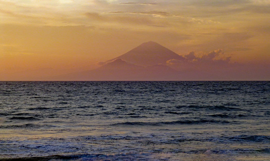 Die Silhouette vom 50 km entfernten Gunung Agung auf der Insel Bali