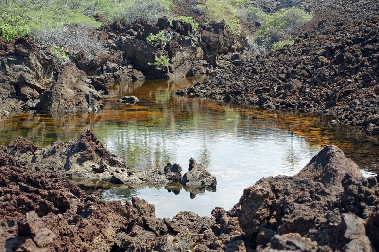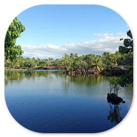Hinter den Sandstränden verbergen sich oft Süßwasserponds, in denen seltene Fische, Muscheln, Krebsarten oder Vögel. ihre Heimat finden. Hier ein Bild vom Fischteich am Mauna Lani Hotel.