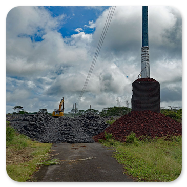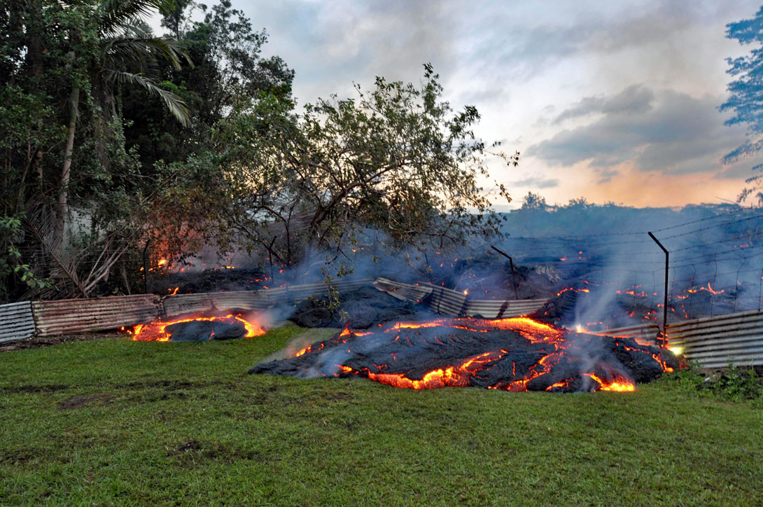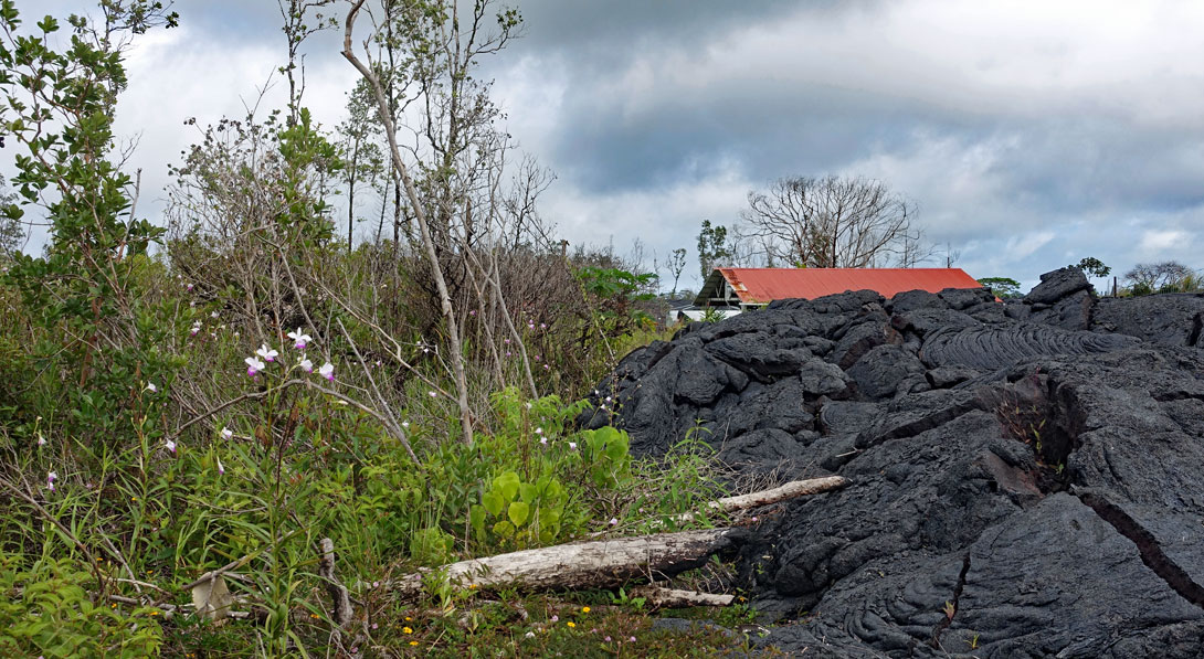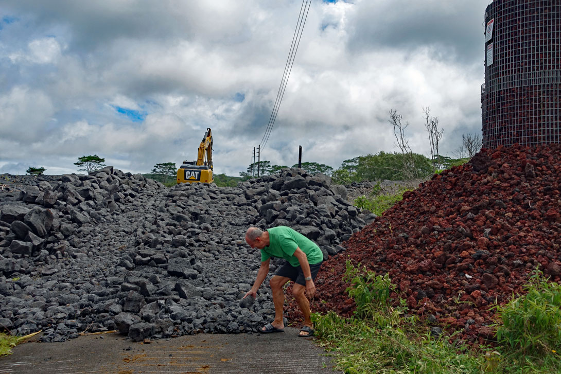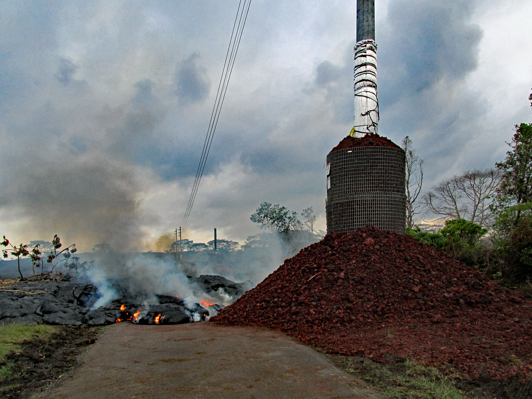 Bei einem erneuten größeren Ausbruch des Kilauea am 27.Juni 2014 floss die Lava wieder in zwei Strömen den Berg hinunter, bis sie im Dezember in Pahoa zum Stillstand kam. Man kann sich die Lavamassen anschauen, die in Pahoa über die Apaa Street geflossen sind, wenn man über Hilo nach Pahoa fährt. Das ist schon ein Erlebnis, wenn man vor den Strommasten steht, die mit dicken Steinen und Drahtverhau gesichert wurden, damit die Lava gezwungen wird, drum herum zu fließen. Ich war später noch einmal dort auf der Straße, die zu diesem Zeitpunkt mit einem Bagger wieder freigeräumt wurde. Auf der Fotostrecke können Sie das gut erkennen: