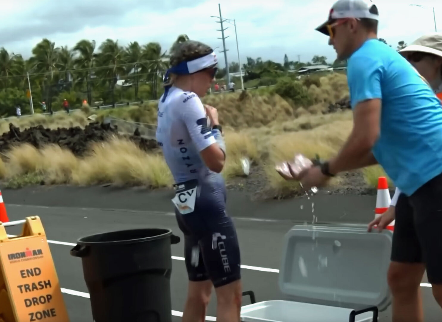 In jedem Jahr sind beim Ironman immer mehr als 6000 "Volunteers" im Einsatz, die an der Strecke stehen, Wasser, Schwämme oder Energiepakete verteilen und dafür sorgen, dass die Athleten nicht vor Erschöpfung umfallen, denn manche Läufer sind ganz schön kaputt, wenn sie nach dem Schwimmen und Radfahren auf die Marathonstrecke müssen. Die freiwilligen Helfer sorgen dann dafür , dass der Triathlon problemlos abläuft. Man kann sie alle an ihren Trikots erkennen, die das hawaiianische Wort "kokua" tragen. Das Wort bedeutet im Übrigen nicht nur "Helfer", sondern auch "Lehrer". Viele Familien fahren an diesem Wettkampftag mit ihren Kindern zu den zugewiesenen Einsatzorten und verbringen dort den ganzen Tag. Und der ganze Tag sind nicht nur die 12 Stunden, sondern oft wesentlich mehr, denn der Wettkampf endet erst nach 17 Stunden um Mitternacht.