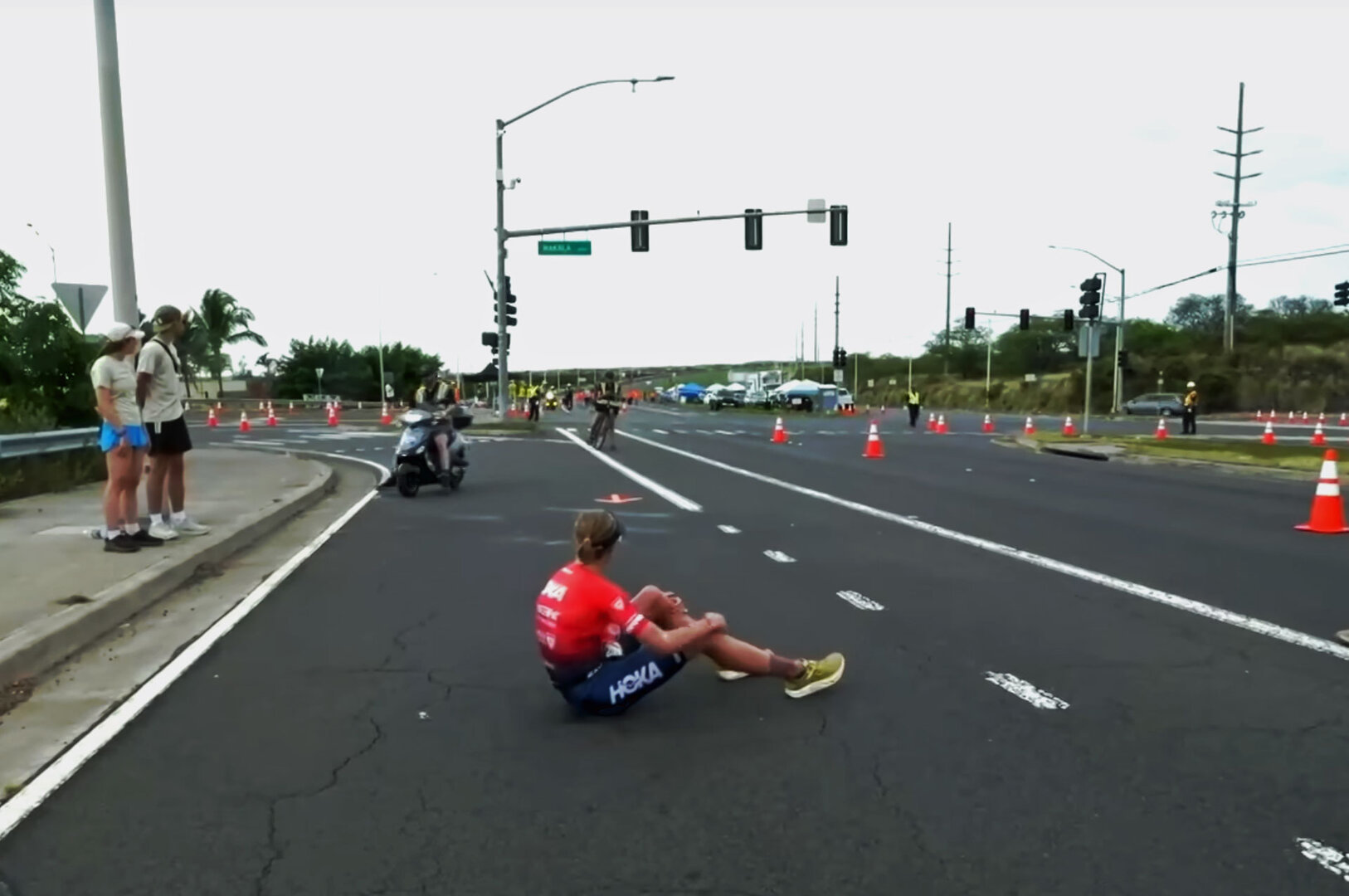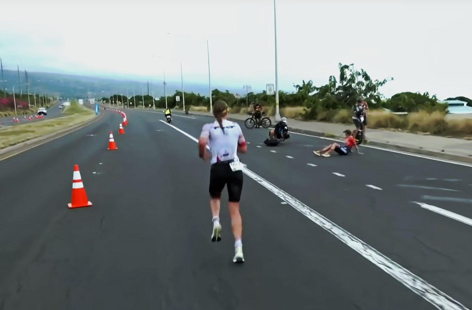 Ich stand mit meiner Schwiegertochter Doris und ihrer Freundin Kathrin an der Verpflegungsstelle beim Mauna Lani Resort am Highway, als sie als erste angeschossen kam und wenige Meter hinter ihr Taylor Knipp auf ihrer bunten Rennmaschine. Alles ging so schnell, dass ich kaum ein Foto machen konnte.