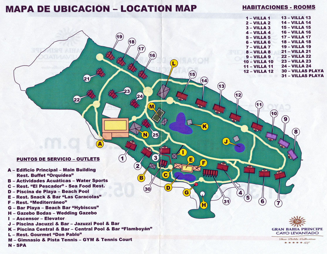 Das idyllische Inselchen ist 800 Meter lang und 300 Meter breit. In einem Spaziergang könnte man sie in einer halben Stunde bequem umrunden. Leider ist das aber nicht möglich, weil die Insel zu einem Teil im Besitz der Hotelkette Gran Bahia Principe ist und kein Weg am Strand entlang führt. Die Inselwege sind auf der folgenden Karte eingezeichnet und der weiße Bereich ist der öffentliche Teil.