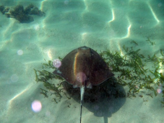 Der Strand im Südwesten fällt flach ab und ist von großen Seegrasfeldern durchzogen. Man kann beim Schnorcheln ein paar kleine Fische beobachten und auf dem Grund zwischen dem Seegras ein paar Seesterne sehen. Zum Schwimmen ist das auch nicht optimal; da muss man schon ein Stück weiter hinausschwimmen. Ganz schön ist es außen um die kleine Insel herum, die man zu Fuß erreichen kann.