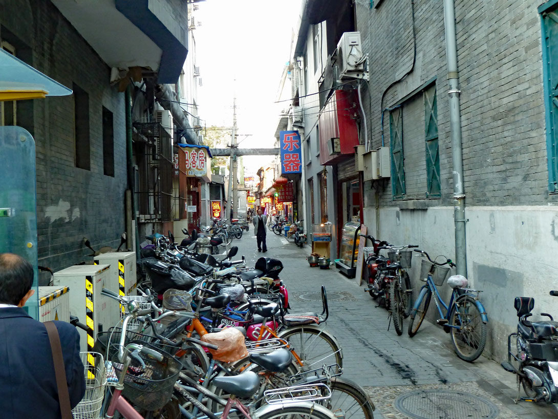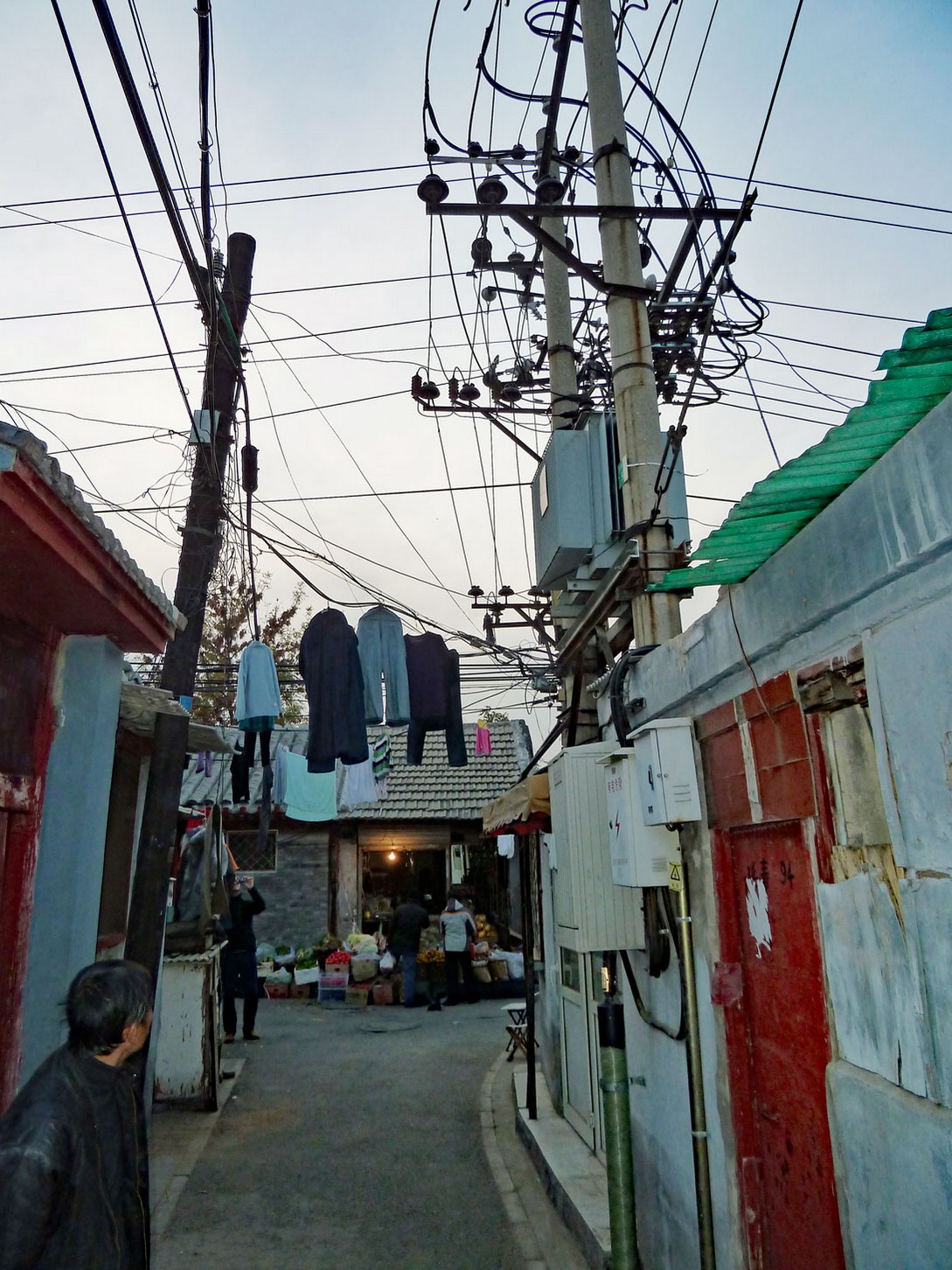 Hutong ist ein mongolisches Wort und bezeichnet eine Gasse. Vor einigen Jahren gab es in Peking noch sehr viele solcher Gassen, aber die wurden alle abgerissen und durch neue Häuser ersetzt. Auch das Altstadtviertel, durch das wir jetzt mit einer Rikscha fahren, wird in zwei Jahren abgerissen, erklärt uns Liu. Aber jetzt sieht es in der Tat noch so aus, als fühlte man sich in das alte China versetzt Die Gassen sind in der Tat sehr eng und vollgestellt mit Fahrrädern, Rollern, Karren und Autos, die irgendwo etwas abladen oder aufladen. Natürlich sind auch wieder versteckte Hauseingänge, seltsam riechende Garküchen, exotische Verkaufsstände und abenteuerlich verlegte Elektroleitungen zu beobachten.