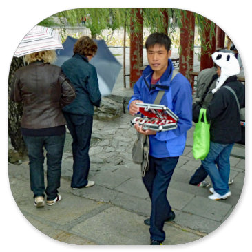Dennoch schaffen es die Chinesen, die riesigen Menschenmassen überall durch die Security-Kontrollen zu schleusen, ohne dass es große Verzögerungen gibt. Hier unter dem Platz ist eine U-Bahnstation. Natürlich muss jede Tasche durch den Röntgenapparat geschoben werden. Auf der anderen Seite geht die Treppe unter der Hauptstraße hindurch zum Kaiserpalast - auch hier die gleiche Kontrolle. Beim Eingang zum Kaiserpalast: Wieder eine Kontrolle. Und so fort. Auf allen Straßenkreuzungen finden wir wie in den Kaufhäusern kleine, dunkle, halbrunde Kugeln mit Kameras. Wenn wir auf der Autobahn fahren, blitzt es in gewissen Abständen und der Fahrer erklärt uns, dass er wieder fotografiert worden ist. Aber irgendwie lässt es sich auch damit leben. Wir stellen jedenfalls fest, dass China trotz allem sehr weltoffen geworden ist.