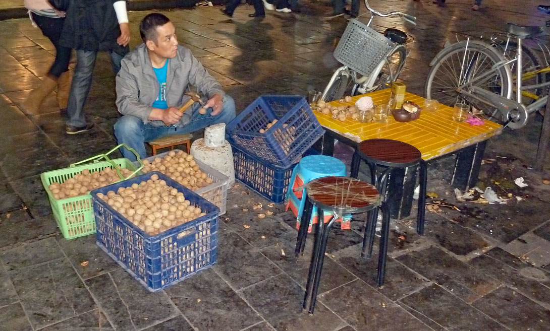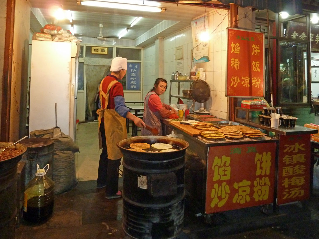 In der Altstadt lässt es sich dann wunderschön bummeln, weil alle Geschäfte von 10:00 bis 22:00 Uhr geöffnet sind. 7 Tage die Woche. Viel Polizei läuft herum. Aber das verleiht uns auch ein bisschen das Gefühl der Sicherheit. Natürlich erkennen die Chinesen jeden Touristen sofort und wir werden oft angesprochen, ob wir nicht eine Rolex oder einen Montblanc-Füller kaufen wollen (davon später noch einiges), aber es bedrängt uns keiner. Wenn man ablehnt, wird man in Ruhe gelassen. Die Altstadt ist wirklich pittoresk mit den alten Fassaden. Feng lädt uns zum Teigtaschen-Essen in ein Restaurant ein, wir verzichten aber auf die berühmten Köstlichkeiten, als wir sehen, dass es sich um die elenden geschmacklosen Dinger handelt, die mit Sauerkraut, Pilzen oder anderen undefinierbaren Sachen gefüllt sind, die wir schon vor drei Wochen in der Ukraine nicht mochten. Stattdessen machen wir einen Spaziergang auf eigene Faust durch die nächtlichen Gassen und sind begeistert von den Häusern und vom Leben in den Gassen. Dazwischen befindet sich ein altes Teehaus mitten in einem kleinen See, das uns sehr gefällt. Es gibt so viele Motive, dass man nicht aufhören könnte zu fotografieren.