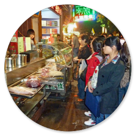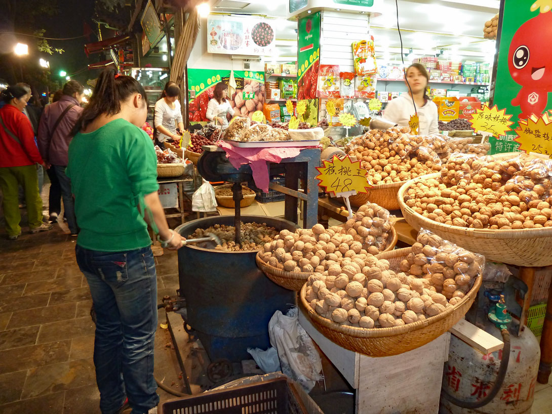 Wir fahren am Abend in die Altstadt, die wunderschön beleuchtet ist. Die Chinesen haben eine Vorliebe für bunte Beleuchtung, rote Laternen, blinkende Lichter und allerlei Lichteffekte. So schmückt halt jeder sein Haus oder seinen Verkaufsstand mit irgendwelchen Lichterschlangen. Das sieht natürlich toll aus.
