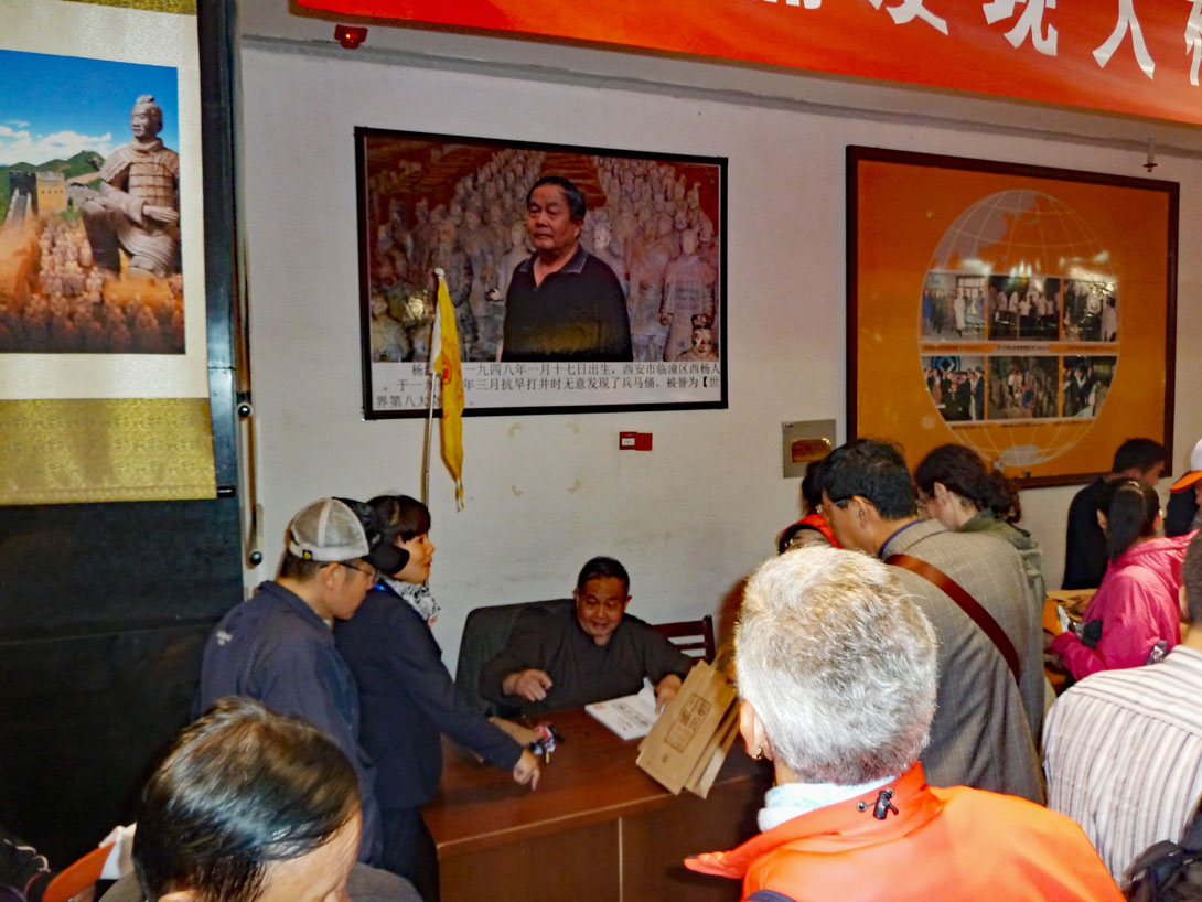 In Shanghai war es bei unserer Ankunft 10:03 Uhr und 25°C. Die Immigration lief ab wie am Schnürchen: 50 Schalter waren geöffnet und die ankommenden Menschenmassen wurden perfekt verteilt, sodass wir eine Viertelstunde später schon mit unserem Gepäck durch den Ausgang marschierten, wo eine 50 m lange Warteschlange mit Schildern Spalier stand, um die Fluggäste abzuholen. Feng Wei, unser Reiseleiter stand am Ende der Schlange und begrüßte uns. Zwei andere Gäste aus Stuttgart trafen wir noch und freuten uns, dass die Reise zu viert los ging. Aber Feng holte nach und nach noch 9 Gäste aus den nächsten Maschinen aus Hongkong oder Amsterdam, sodass wir auf 13 anwuchsen.