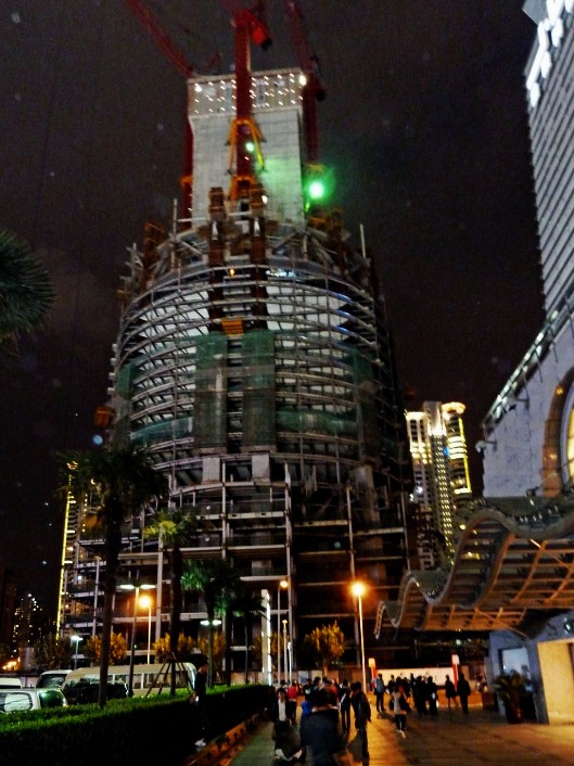 China ist top - das Land muss nicht noch entwickelt werden. Es hat Europa und auch Amerika bereits überholt. Das beweist der Blick von hier oben. Nebenan hören wir die Presslufthämmer und sehen die blau zuckenden Blitze der Schweißgeräte aufleuchten: Hier entsteht gerade in Tag- und Nachtarbeit das höchste Gebäude Chinas: der 632 m hohe Shanghai-Tower. Schauen Sie mal bei Wikipedia nach, was daraus geworden ist. Es ist beeindruckend. Und die Chinesen realisieren alles. 2015 wurde der Tower eröffnet. Er hat 106 Aufzüge und die höchste Aussichtsplattform der Welt. Auf dem rechten Bild sehen Sie das Foto aus Wikipedia. Der Turm hat das Stadtbild und die Skyline von Shanghai völlig verändert. Der Gebäude ist nach dem Burj Khalifa in Dubai und dem Tokio Tower das dritthöchste Gebäude der Welt.