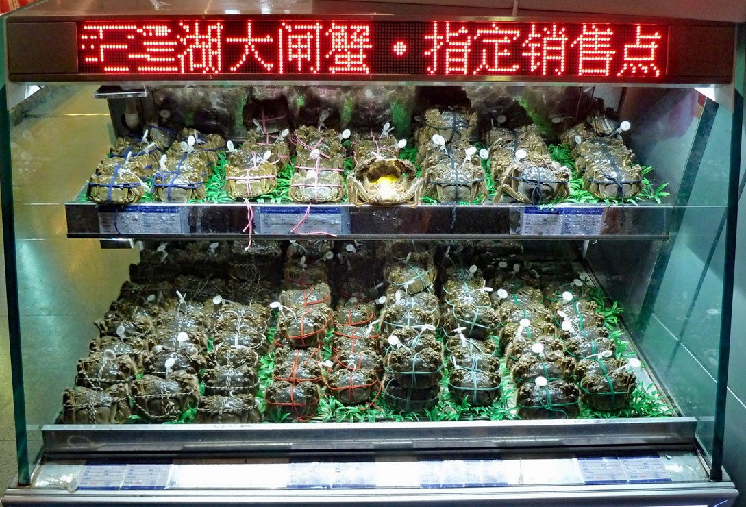 Am Flughafen in Pudong fahren wir am Domestic-Airport vor, der supermodern und sehr großzügig nur die Inlandsflüge abwickelt. Hier fliegen vornehmlich Chinesen nach Hause, die in der großen Weltstadt Shanghai zu Besuch waren. Viele nehmen elektronische Sachen oder Spielzeuge mit. Als Souvenir nimmt der Chinese die berühmten Wollhandkrabben mit nach Hause, die eine Spezialität von Shanghai sind. Diese werden an den Gates in Tiefkühltruhen lebend gehalten und angeboten, damit sie noch gut frisch sind, wenn sie als Mitbringsel zu Hause bei der Schwiegermutter auf dem Land in den Kochtopf wandern. Nicht auszudenken, wenn so ein Vieh im Flugzeug aus dem Handgepäck krabbelt...