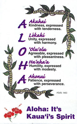"Aloha" hat eine ganz besondere Bedeutung in Hawaii. Es ist nicht nur ein reines Begrüßungswort, sondern es ist eine Lebensphilosophie. Ursprünglich ist das Wort zusammengesetzt aus "Alo", das bedeutet Vorhandensein, Gesicht oder Anwesenheit. "ha" bedeutet Atem. Man könnte es übersetzen mit: "Hauche dem Gegenüber den Atem des Lebens ein." Es wird auch so ausgesprochen, als wenn es ausgehaucht würde : Alo-ha. Es ist also eine Lebensart, eine Art und Weise, mit der man sich im Leben mit Liebe, Achtung und Respekt begegnet. Im tieferen Sinn bedeutet das, sich selbst mit allen Sinnen zu lieben und diese Liebe dann an alle anderen Menschen weiterzugeben. Bei den alten Hawaiianern war es der Wille, seinen Körper und seine Seele in Einklang zu bringen, positive Energie zu erzeugen und diese an andere weiterzugeben.Dieses Bestreben, in Harmonie leben zu wollen, spürt man sogar als Tourist überall in Hawaii; es macht auch irgendwie einen Teil des Gefühls aus, hier im Paradies zu leben. Es macht sich bemerkbar im Lächeln der Gesichter, in der Freundlichkeit der Menschen und im Verständnis für viele Kleinigkeiten und Probleme, die das Leben so mit sich bringt. Das ist wunderschön und macht das Leben und auch den Urlaub leichter. Es ist immer dann zu spüren, wenn man mit den Einheimischen in Kontakt gerät und aus dem reinen Tourismus-Geschäft herauskommt, der naturgemäß die Inseln beherrscht.