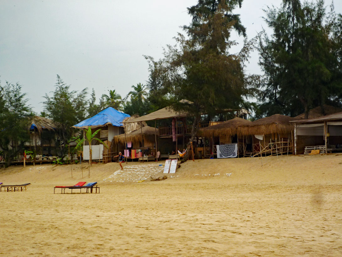 Einen Kilometer weiter nördlich kann man über die Felsen zum Nachbarstrand klettern, der mit den primitiven Hütten noch ein bisschen von dem alten Hippie-Flair aufweist, das hier mal so kennzeichnend für Goa war. Leider macht das Klettern über die Felsen keinen Spaß, weil überall die Sch...haufen von den Arbeitern hier liegen, die zwischen den Felsen ihre Notdurft verrichten.