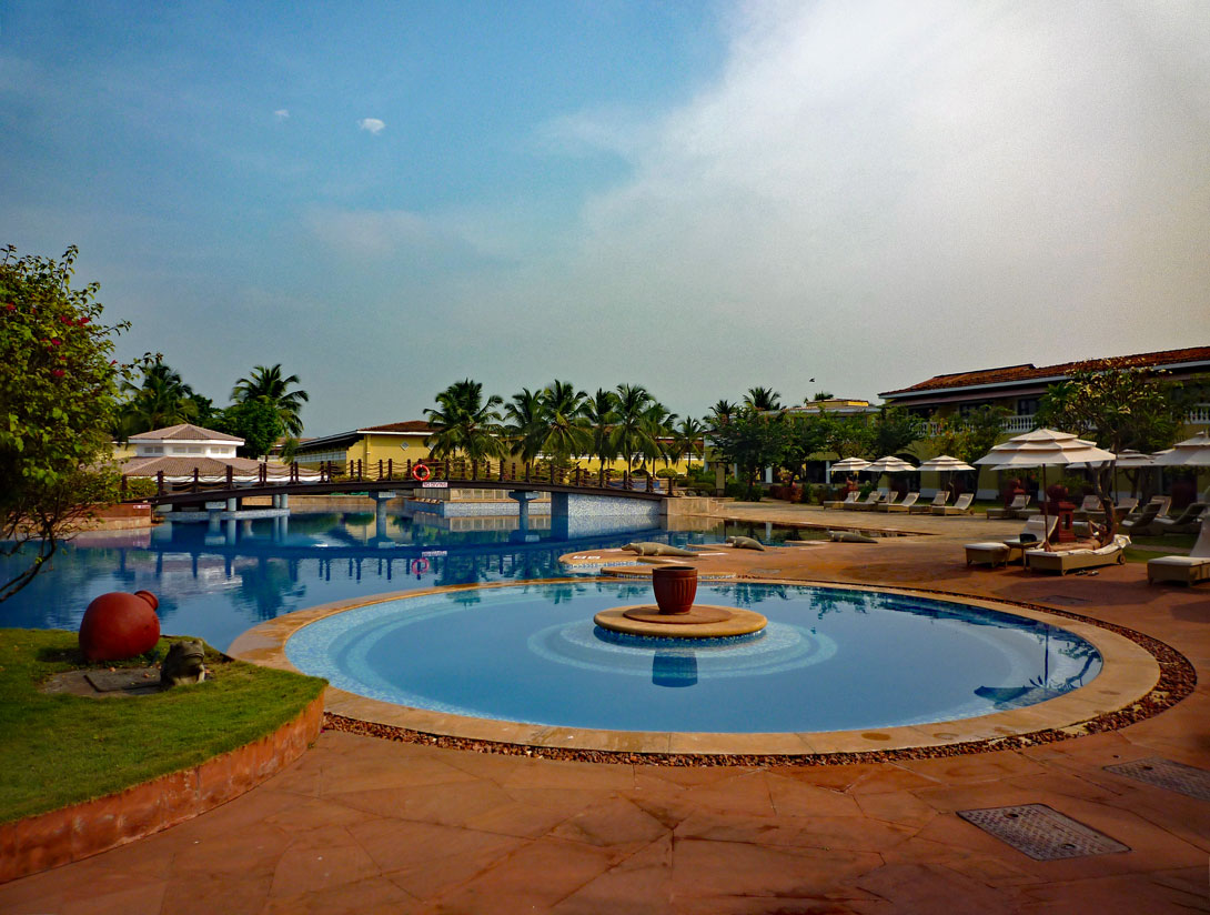 Die Hotelanlage ist sehr großzügig angelegt. Es gibt eine große Pool-Landschaft mit mehreren Becken, einer Pool-Bar und einem angedeuteten Wasserfall. Dazu genügend bequeme Liegestühle, Auflagen und Sonnenschirme. Alles sehr schön, wäre da nicht die indische Komponente dabei: Das sind die Krähen, die krächzend über die Anlage umherfliegen, sich überall niederlassen und von niemandem gestört werden, weil diese intelligenten Vögel ja hochrangige Götter sind, deren Gestalt wir im nächsten Leben durchaus annehmen könnten. Dass sie mit ihrem Kot alle Liegen, die Tische und den Boden beschmutzen, nimmt man gelassen hin. Dafür kommt dann eben alle fünf Tage der Hochdruckreiniger zum Zuge, der die Anlage geräuschvoll wieder von allen gelblich-weißgrauen Ablagerungen säubert.