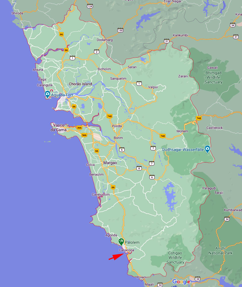 Die Lage der Strände kann man auf der folgenden Google- Karte gut erkennen: Der südlichste Strand (RajBaga Beach) gehört zum Lalit Hotel, darüber ist der Patnem Beach mit einigen Häusern und kleinen Hotels.