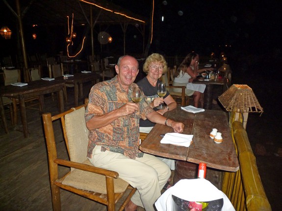 In der Tat war der beste Tisch des Restaurants ganz vorn zum Strand und Meer für uns reserviert. Natürlich war auch hier nichts los; lediglich zwei englische Ladies saßen am Nachbartisch und begrüßten uns freundlich. Der Kellner machte ein Foto von uns und wir durften aussuchen, was das Herz begehrt. Natürlich wählten wir nach entsprechenden Vorspeisen (Kartoffelsuppe mit Spinat, dazu Naan mit Knoblauch und Käse - anschließend Prawns im Teigmantel mit mariniertem Weißkohl und Barbecue-Sauce den riesigen Lobster (Paul) und den Red Snapper (Inge) aus, die vor uns in der Eisschale lagen und auf das Grillen warteten.Der Koch grillte alles perfekt mit Gemüse und Reis und wir genossen alles zusammen mit einem gut gekühlten Bohemian Chenin Blanc 2007 aus Südafrika, den bezeichnenderweise Kingfisher von dort eigens importiert hat, der hier die Airline betreibt und die Brauereien unter Kontrolle hat.
