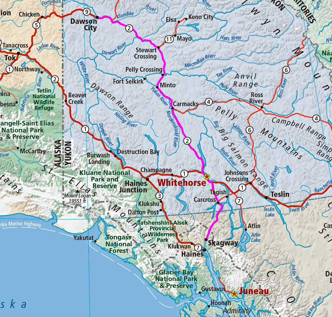 Bis Dawson City, am Zusammenfluss des Klondike in den Yukon gelegen, ist es eine gemütliche Tagesreise. Sie sollten allerdings Ihre Unterkünfte vorbuchen. Die Städte dort oben sind viel kleiner, als wir uns das hier vorstellen. Selbst Whitehorse, die Hauptstadt des Yukon Territory, hat nur 24500 Einwohner. Demnach ist auch das Beherbergungsangebot nicht besonders groß. Gute Erfahrungen habe ich auch mit Bed & Breakfast - Unterkünften gemacht. Das ist besonders für Dawson City interessant. Wenn Sie aber Ihr Haus auf vier Rädern dabei haben, ist das natürlich alles kein Problem.