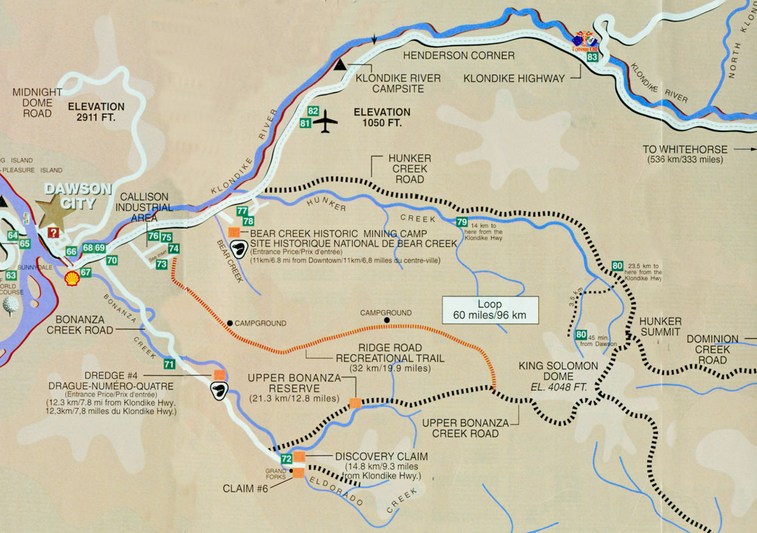 Sie besorgen sich also den "Guide to the Goldfields", das ist eine kostenlose Zeitung, die es überall am Yukon gibt. Sie bekommen sie schon in Whitehorse. Den Guide to the Goldfields bekommen Sie sogar in gebundener Form schon für 20,51 € bei Amazon und können ihn zu Hause studieren. Oder Sie observieren auch direkt den "Dawson City Service Guide" mit einer Karte der umliegenden Goldfelder. Beim Lesen geht Ihnen so richtig das Herz auf: Namen wie "Bonanza Creek", "Discovery Claim" oder "Bear Creek Mining Camp" lassen den Puls emporschnellen und gönnen Ihnen ab jetzt keine ruhige Minute mehr. Nichts wie hin!