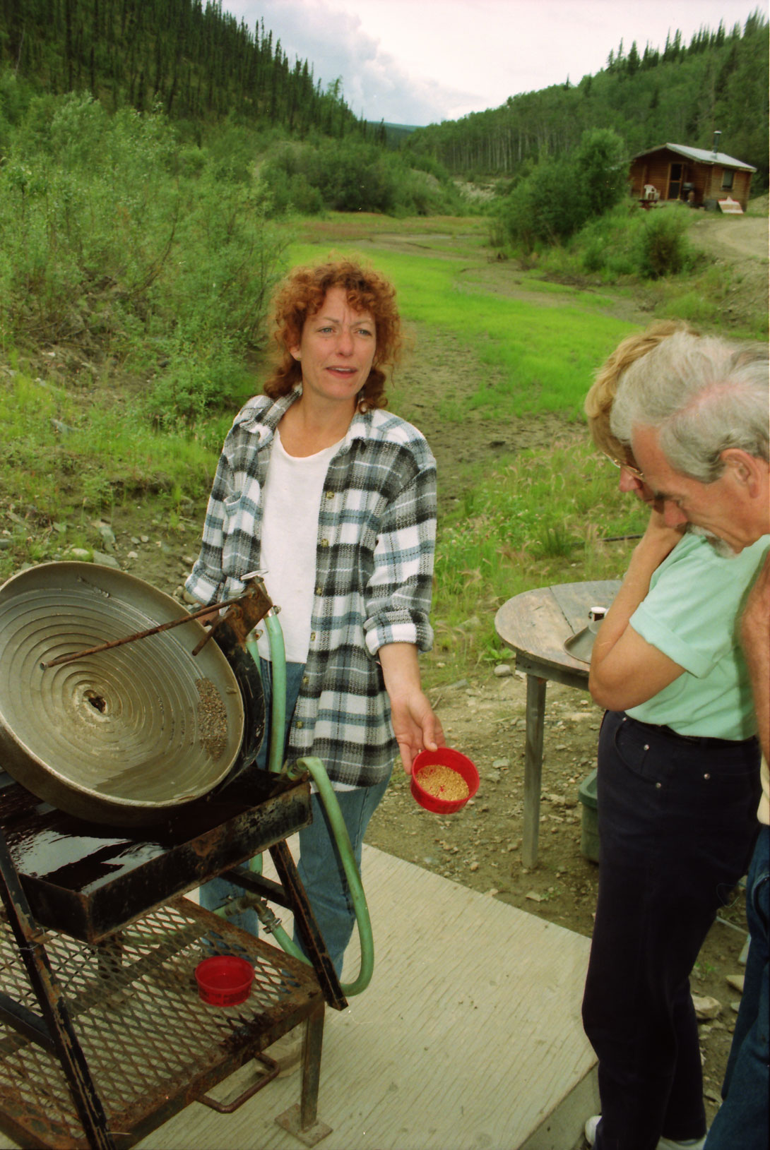 Sie selbst hat eine Gold-Waschmaschine - eine raffinierte Erfindung aus der Goldrush-Zeit -: Auf einer mit Wasser angetriebenen Blechschüssel wird durch kontinuierliches Spülen mit dem Wasserschlauch das Gold ausgewaschen. Stolz zeigt sie auf dem Foto die Tagesausbeute.
