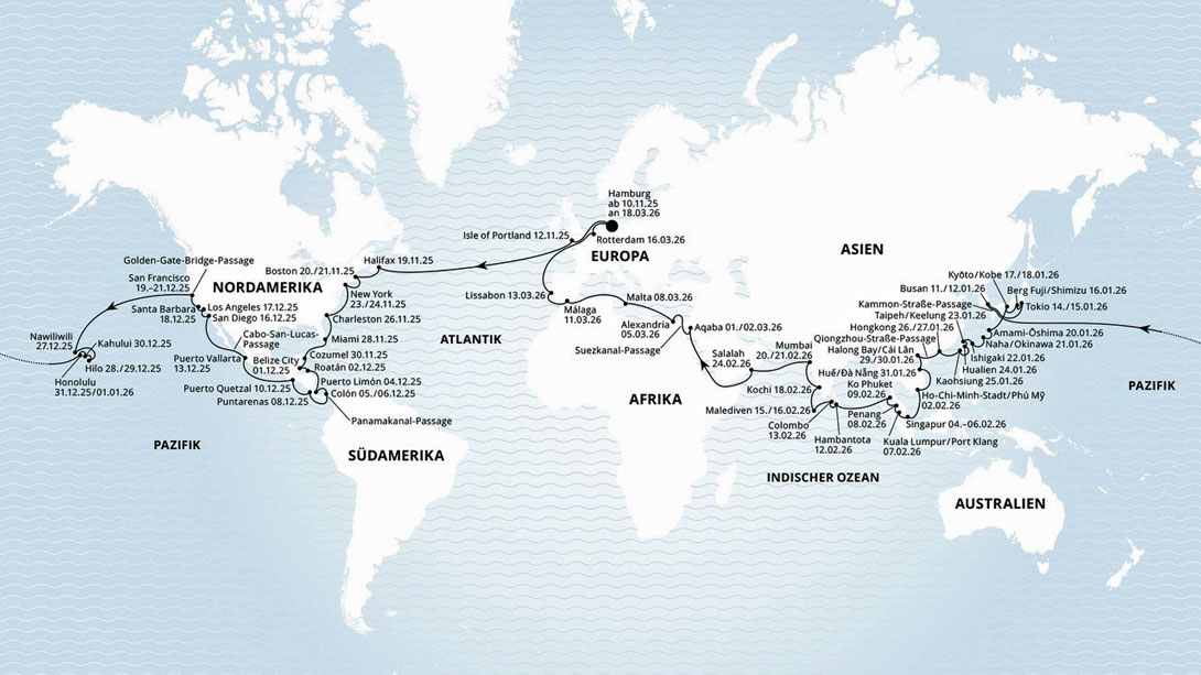 Interessant ist immer eine Teilstrecke. Im Januar 2026 startet zum Beispiel die Queen Anne ab Hamburg. zu einer Weltreise.