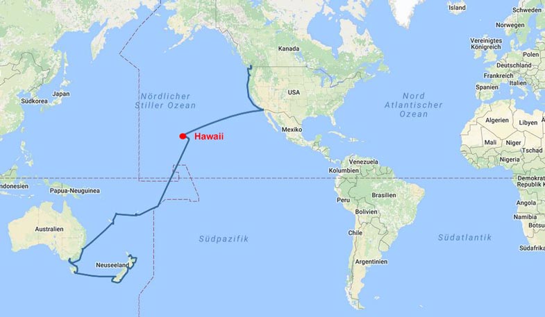 Auf der Karte sehen Sie die Route der meisten Kreuzfahrtschiffe, die von Australien aus nach Hawaii starten. Die Reise von Deutschland mit dem Schiff ins Südseeparadies ist nicht so einfach, weil Hawaii eben auf der anderen Seite der Weltkugel liegt. Die 12 Stunden Zeitunterschied machen das schon deutlich.