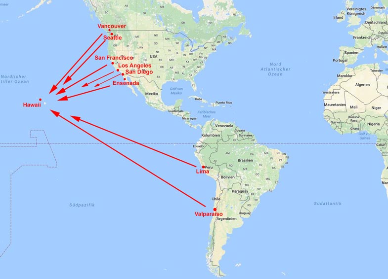 Wie kommt man mit dem Schiff von Deutschland nach Hawaii, wenn man das Flugzeug vermeiden will? Trotz der vielen Flugverbindungen gibt es immer noch Leute, die entweder Flugangst haben oder einfach nicht einen 20-stündigen Flug akzeptieren wollen, um an ihr Ziel zu kommen. Ältere Menschen haben zudem oft Thrombose-Probleme und wollen eine solche lange Flugdauer nicht auf sich nehmen.