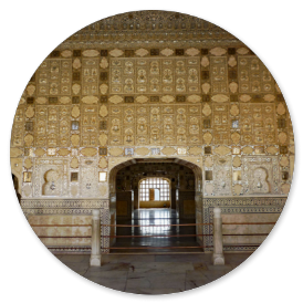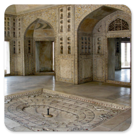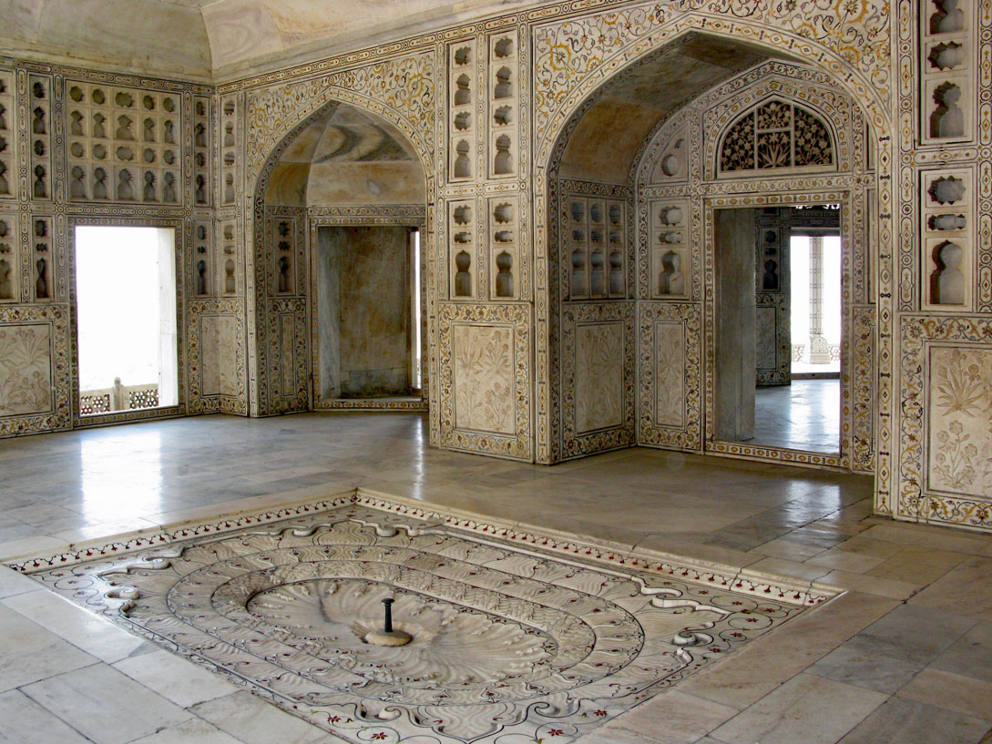 Das riesige Mausoleum ist 1631 auf einer 5m hohen und 100x100m großen Marmorplattform errichtet worden zu Ehren der Lieblingsfrau des Großmoguls, mit der er 18 Jahre verheiratet war und die ihm 14 Kinder gebar. Bei der Geburt ihres 14. Kindes ist sie gestorben. 20000 Handwerker und mehr als 1000 Elefanten haben 17 Jahre an dem Bau gearbeitet. Von Acay hören wir die tränenreiche Geschichte und die Legenden, die sich um dieses Bauwerk ranken. Als ausländische Besucher haben wir am Ticketschalter jeder eine Flasche Wasser und ein paar Überzüge bekommen, sodass wir die Schuhe nicht ausziehen müssen, um ins Innere zu kommen. Dort ist das Fotografieren streng verboten und wir erhaschen einen Blick vom Sarkophag, der mit Tausenden von Edelsteinen geschmückt ist, die als Intarsienarbeit in den Marmor eingelegt sind. Dank meiner kleinen digitalen Lumix kann ich ein Bild davon zeigen. Der Schrein in der Mitte ist von der Ehefrau, der größere Schrein links, der die ursprüngliche Symmetrie zerstört, ist vom Großmogul selbst, der später (1666) neben seiner Frau beerdigt wurde.