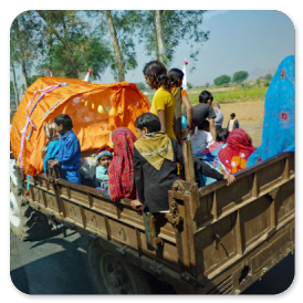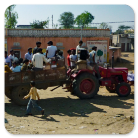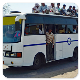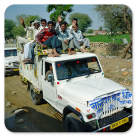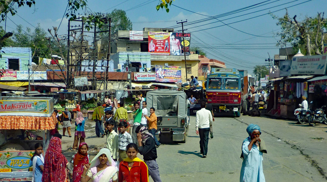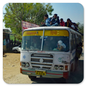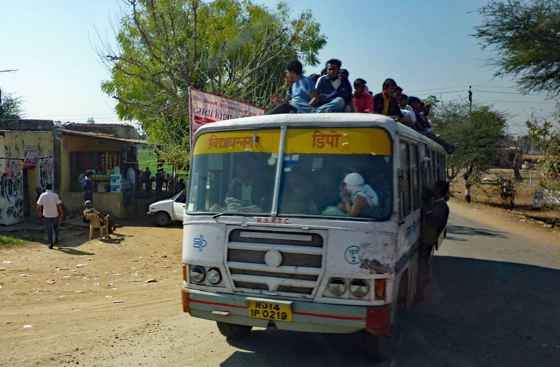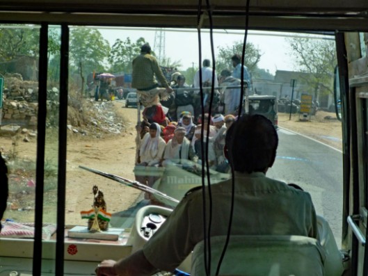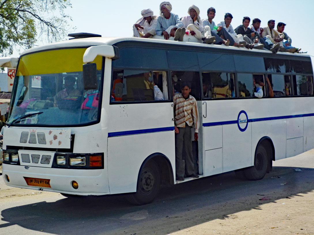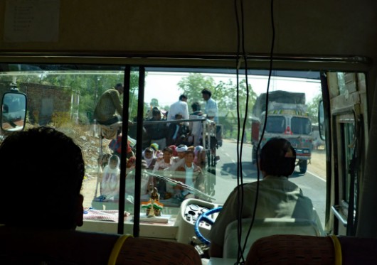 Schon bei der Abfahrt bekommen wir einen Vorgeschmack von den vollen Straßen. Zunächst quälen wir uns durch den dichten Verkehr in Delhi, der dauernd ins Stocken kommt. Die Ausfallstraßen aus Delhi sind zwar fast alle vierspurig, aber hoffnungslos verstopft. Es herrscht Linksverkehr und wir müssen dauernd stehen bleiben. Die Wartezeit nutzen Verkäufer, die an die Busfenster klopfen, damit die Fahrgäste die Fenster öffnen und etwas kaufen. Sie stehen überall - an den Ampeln, Kreuzungen und Staustellen. Besonders viele Kinder sind darunter.
