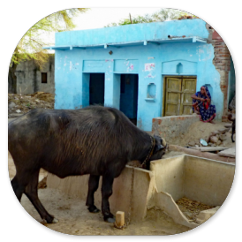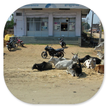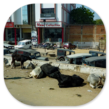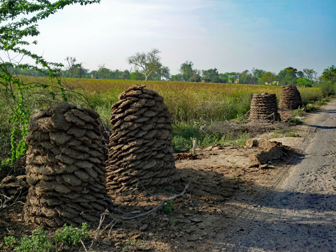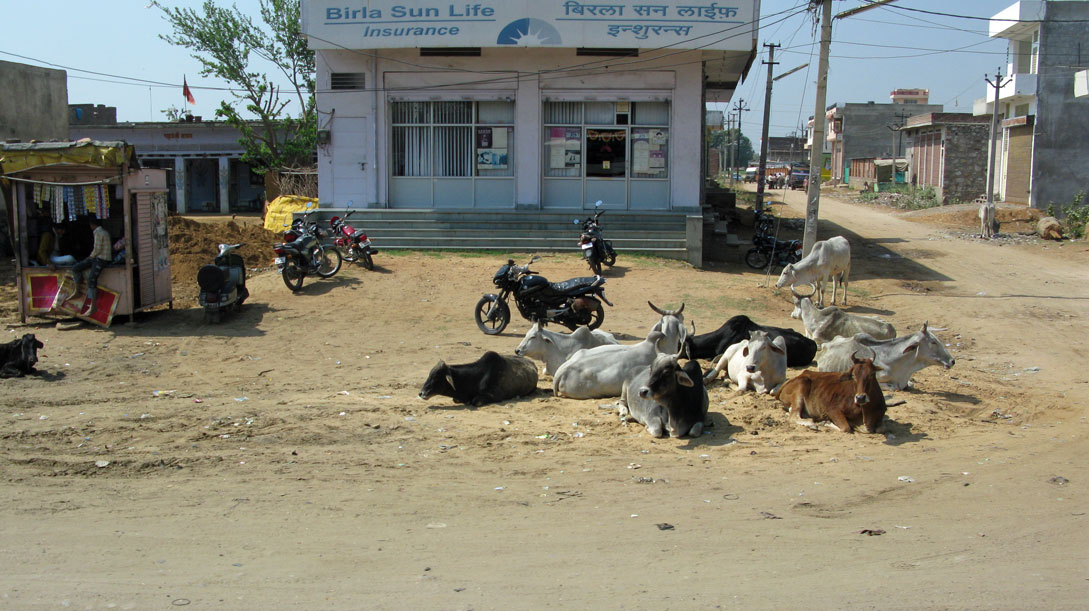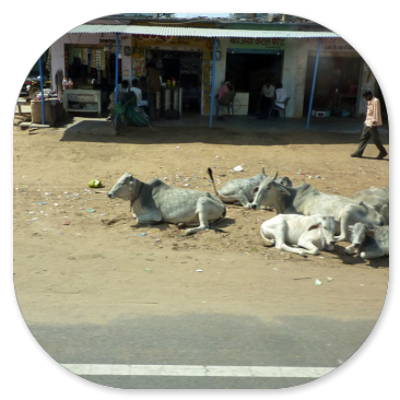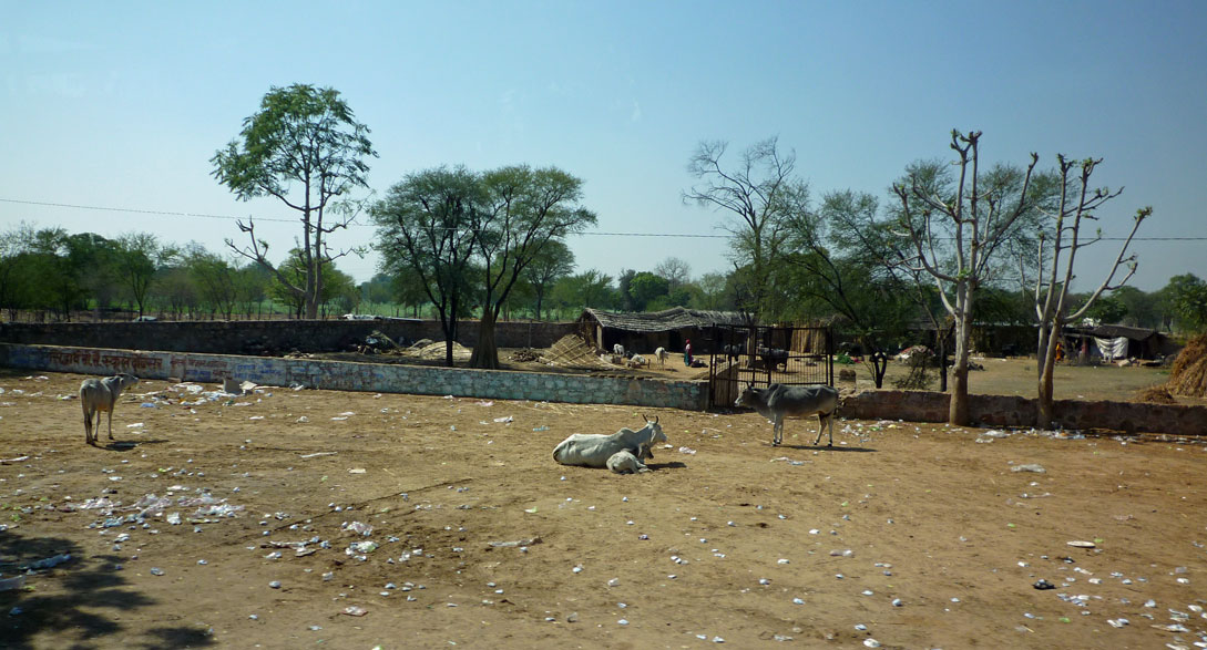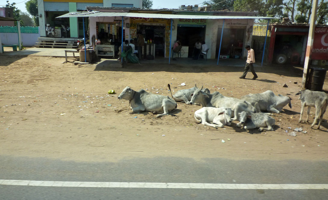 Die Kühe sind allerdings ein Völkchen für sich. Kühe grasen in Indien nicht auf der Weide, sondern im Schutt neben der Straße, weil dort genug Müll zu finden ist, von dem sie sich ernähren können. Meist sind sie angebunden, damit sie nicht weglaufen können und ihre Haufen dort hinterlassen, wo man sie direkt auffegen kann. Schließlich sind Kuhfladen wertvolles Brennmaterial, das sich gut verkaufen lässt. In der Mitte zwischen zwei Fahrbahnen bindet man sie nicht an, damit sie sich auf dem "Grünstreifen" frei bewegen können.