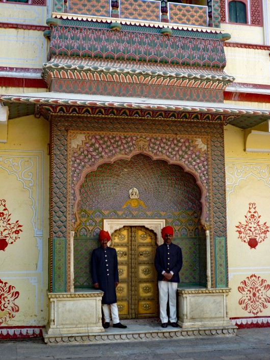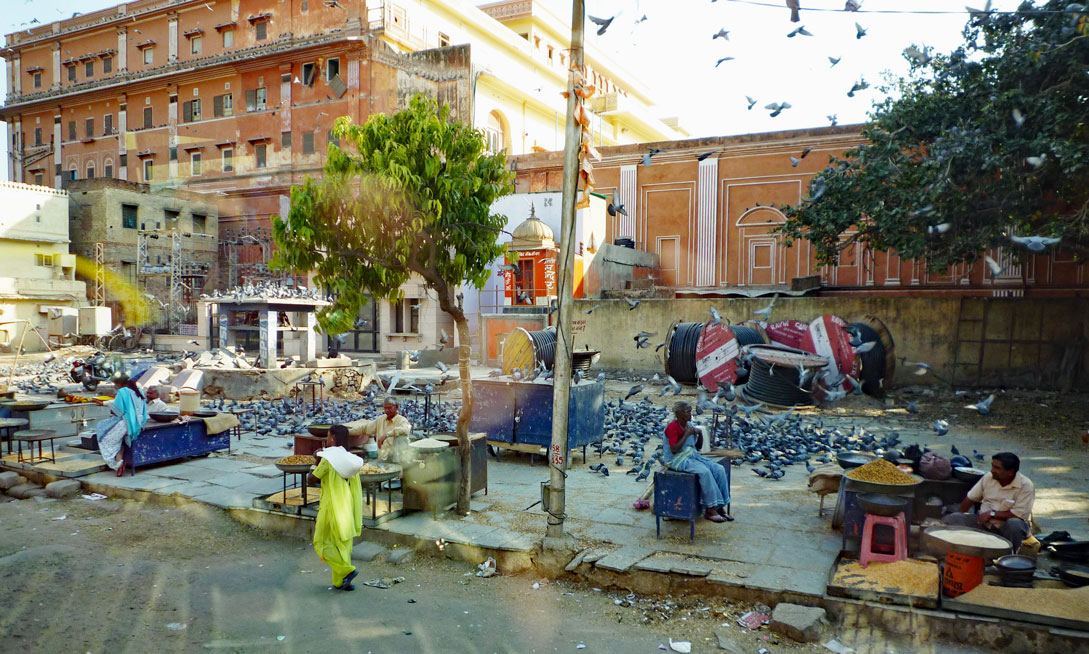 Da Tauben bei den Hindus fast so heilig wie Kühe sind, werden sie fleißig von ihnen gefüttert, weil das als gute Tat gilt, die sich positiv auf die Wiedergeburt und das nächste Leben auswirkt. Dass die Vögel aber mit ihrem Kot den gesamten Sandstein, aus dem die Moschee gebaut ist, konsequent zerstören, stört halt keinen, sondern nur uns unwissende Touristen aus Europa.