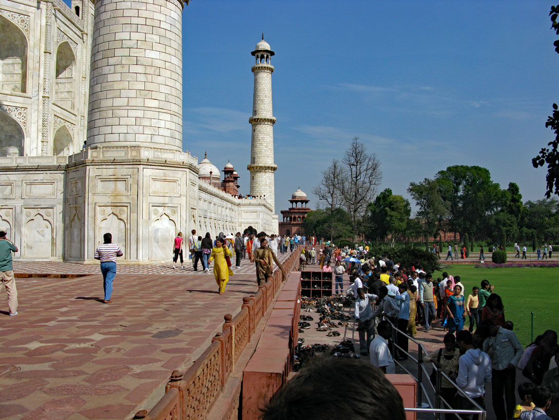 Die Warteschlangen an den Ticketschaltern sind unendlich lang, aber Acay hat es wie auch immer geschafft, dass wir über einen Sondereingang sofort hineinkommen. Wir bezahlen aber auch das Zehnfache pro Person an Eintritt, das ein Inder bezahlt. Dafür bekommen wir eine Flasche Wasser und ein Paar Überziehstrümpfe, damit wir beim Betreten des Mausoleums die Schuhe anlassen können. Schon beim Betreten des mächtigen Eingangstores aus rotem Sandstein, das die äußere Begrenzung der riesigen Anlage bildet, spüren wir die Spannung und Erwartungshaltung unter den Tausenden von Besuchern, die sich hindurchdrängen.