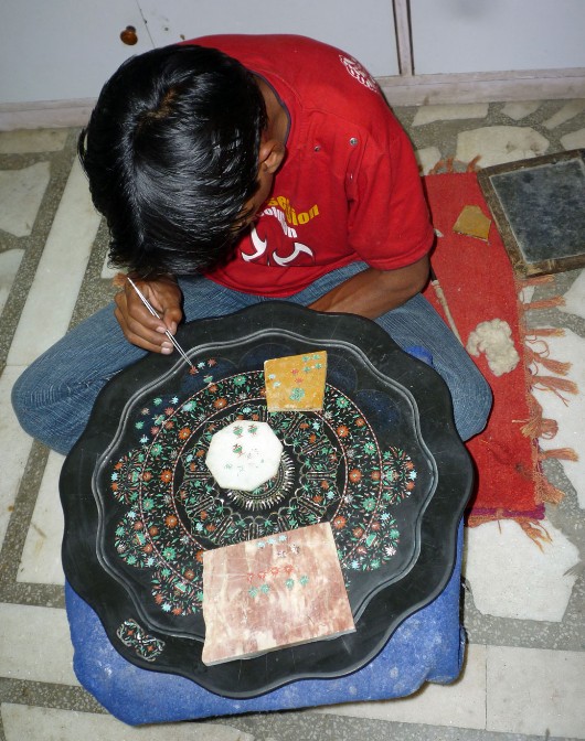 Anschließend fahren wir ins Hotel Clark´s Shiraz Agra, das uns gut gefällt, weil es so wie das Jaipur ist. Nach einer Stunde Ruhepause treffen wir uns zu einer Fahrt in die Intarsien-Werkstatt, die die Edelsteine schleift und in verschiedene Marmorplatten einbaut. Durch die Arbeiten am Taj Mahal hat sich eine uralte