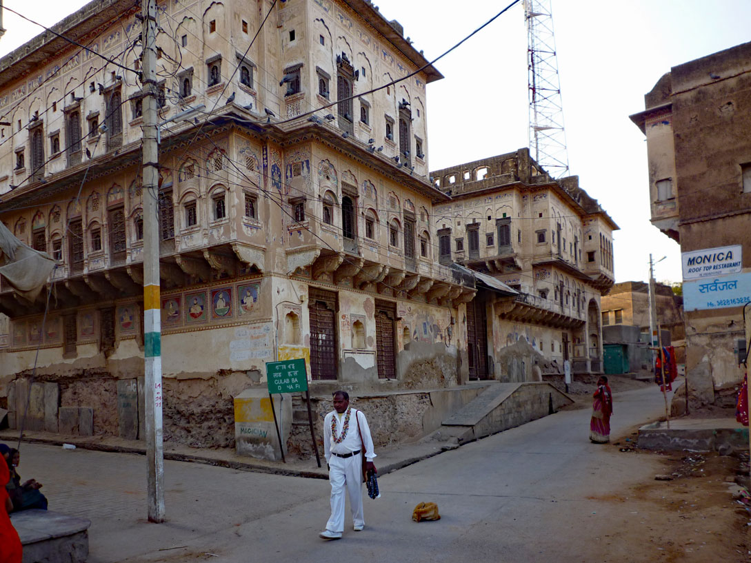 Unser Reiseführer Acay schildert den Ort als "art gallery in the desert", weil die Karawanen auf dem Weg von China zum Kaiberpass hier entlang kamen und sich daraus ein Handelsschwerpunkt entwickelte. Die Kaufleute sind im Mittelalter alle zu großem Reichtum gekommen und haben sich tolle Häuser und Paläste mit schönen Ornamenten, Fresken und Mosaiken geleistet, die als "Havelis" bezeichnet werden. Diese prächtigen alten Kaufmannshäuser werden heute wieder aufpoliert, sind aber blass und haben ihren alten Glanz völlig verloren. Lediglich am Eingang des Palasthotels sind noch farbige Fresken zu sehen, deren Farben einigermaßen leuchten.