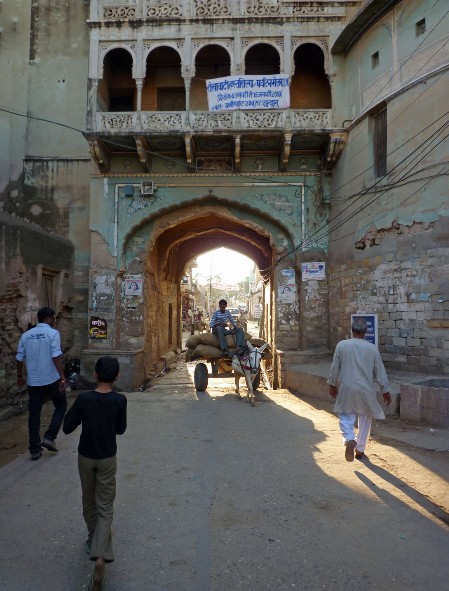 Es kann natürlich auch sein, dass heute wegen des Sonntags so viele Besucher da sind. Und morgen ist Holi, das Farbenfest, da ist auch Feiertag und arbeitsfrei. Durch das hohe Tor hindurch kann man in der Ferne schon einen Blick auf das Mausoleum erhaschen.