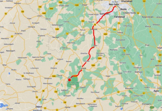 Unser erstes Ziel auf der Fahrt durch Rajasthan ist Sariska, das etwa 200 km südwestlich von Delhi liegt. Um 14:00 geht es los und die Fahrt soll 5 Stunden dauern.