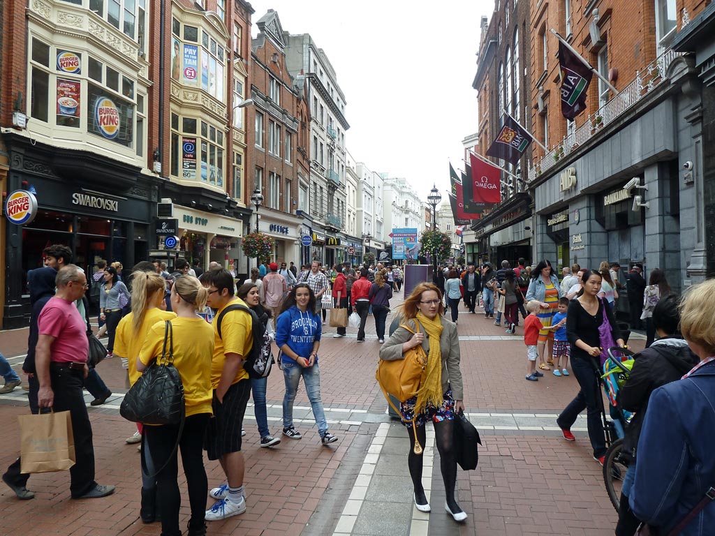 Es ist schade, dass es immer noch so schlechtes Wetter ist. In dem Fußgängerbereich um die Grafton Street begegnen wir außer vielen Touristen auch wieder vielen jungen Muttis. Wie bunt und fröhlich muss doch hier alles aussehen, wenn schönes Wetter ist.