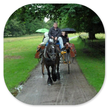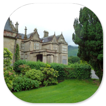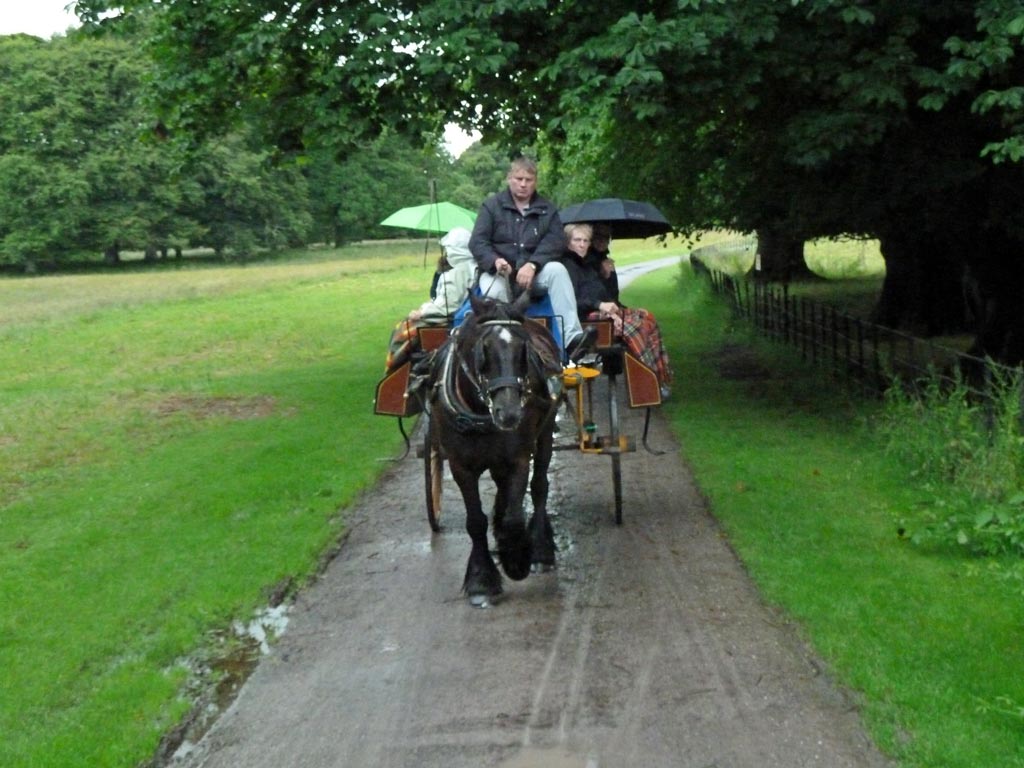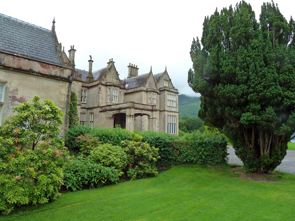 Als wir um 7:15 Uhr frühstücken, sehen wir zum ersten Mal auf unserer Rundreise ein paar blaue Flecken am Himmel, aber die Straßen haben große Pfützen. Es muss in der Nacht stark geregnet haben. Die blass-blauen Stellen am Himmel lassen uns hoffen, denn wir wollen heute den Ring of Kerry fahren. Die 200 km lange Panoramastrecke soll zu den schönsten Stücken Irlands gehören, deshalb sind wir sehr gespannt darauf. Der Bus fährt von Killarney los in den Nationalpark. Als wir am Eingang von Muckross Gardens auf die Kutschen aufsteigen, regnet es schon wieder. Die Schauer verderben uns die ganze Fahrt durch den Schlosspark. Schade, dass die Rhododendronbüsche - und bäume keine Blüten mehr haben und dass die Sonne nicht scheint, sonst wäre das wirklich schön hier!