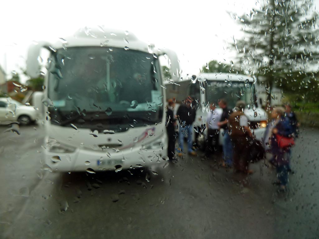 Bei der Abfahrt hat sich am miserablen Wetter nichts geändert. Immer noch Regen. Die Stimmung wird ein wenig besser, als Catherine hinter Bellyhaunis eine Irish-Coffee-Break vorschlägt. Dazu haben der Fahrer Kevin und sie Kaffee im Hotel gekocht, Gläser ausgeliehen und Sahne mitgebracht. Die wird jetzt geschlagen und ein zünftiger Irish Coffee mit einem kräftigen Schuss Whiskey hergestellt. Der nasse Parkplatz am Wegekreuz ist zwar nicht gemütlich, aber wir vergessen dabei den Regen und freuen uns über die gelungene Überraschung der Reiseleiterin.