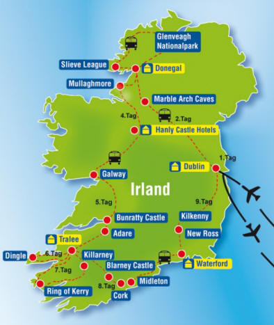 Als wir den Faltprospekt von Trendtours-Touristik bekamen, waren wir sofort von dem Angebot begeistert, eine 10-tägige Rundtour durch Irland zu machen. Das Programm zu dem günstigen Preis gefiel uns deshalb so gut, weil 20 Irland-Highlights enthalten waren, eine Übernachtung in einem Schlosshotel (wir wussten noch nicht, in welchem...) und wir uns auch nicht ums Essen zu kümmern brauchten, weil die Halbpension eingeschlossen war.