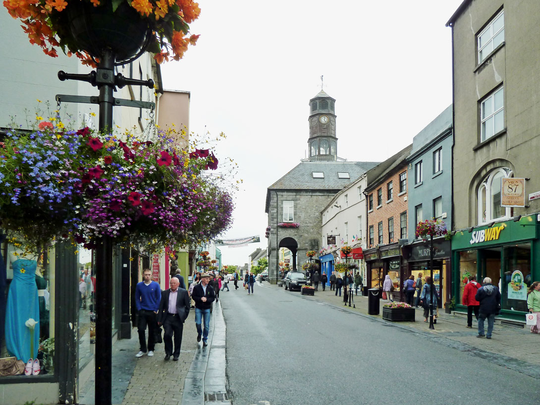 So vergessen wir den Regen und kommen gegen Mittag nach Kilkenny. Das soll die schönste Stadt Irlands sein und sie begeistert uns wirklich. Trotz des Regens sind die Straßen wunderschön mit vielen Blumenampeln geschmückt, die zwischen den vielen bunten Hausfassaden toll aussehen.