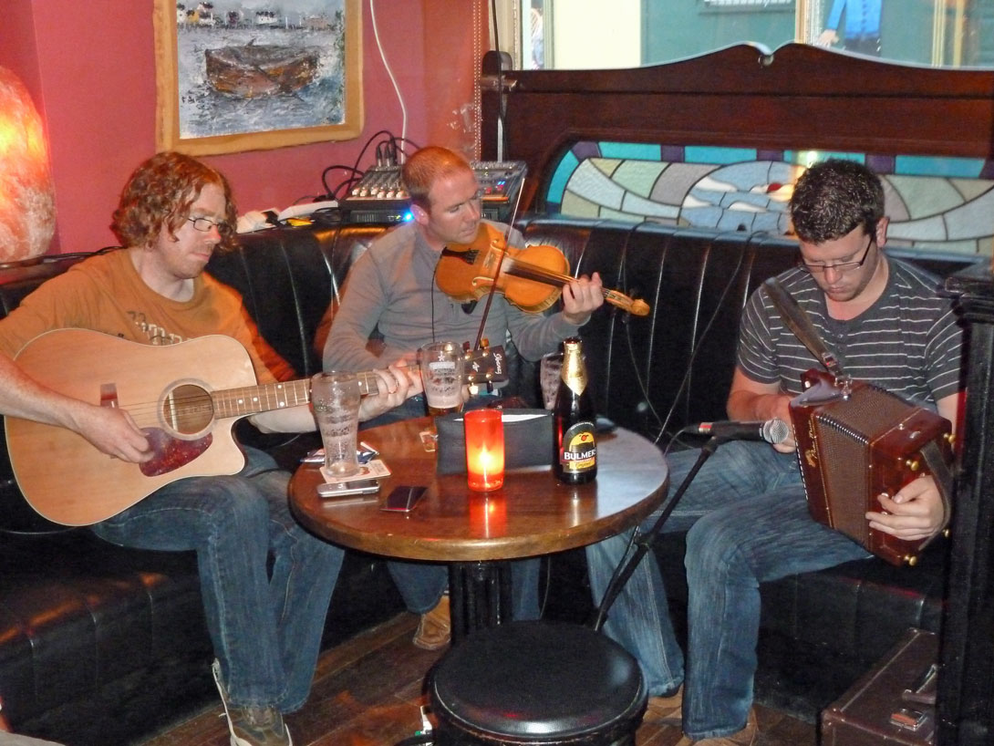 Da das Wetter immer noch schlecht ist, besteht der einzige Lichtblick an diesem Abend in einem Besuch im Pub um die Ecke, in dem drei Iren laute Musik machen.