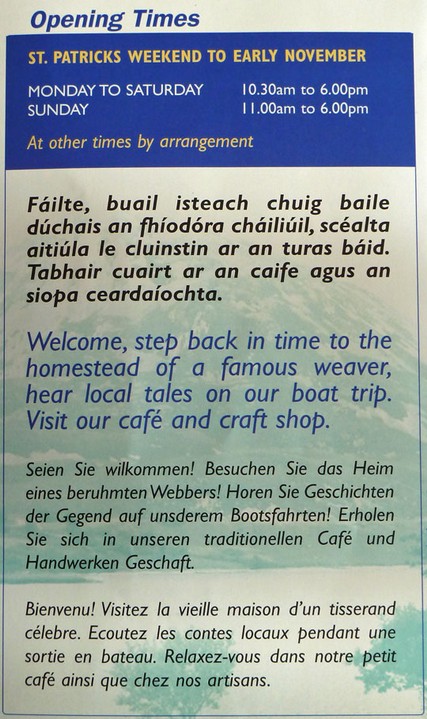 Wir sind froh, dass überall eine englische Übersetzung auf den Schildern und Prospekten steht. Es ist quasi ein Freilichtmuseum in dem Nationalpark.Wir sehen uns einen Film über die Besiedlungsgeschichte Irlands an, werfen einen Blick in die ärmlichen Hütten der Schafzüchter von damals, lassen uns das Weben der Tweedstoffe vorführen und schauen beim Torfstechen zu.