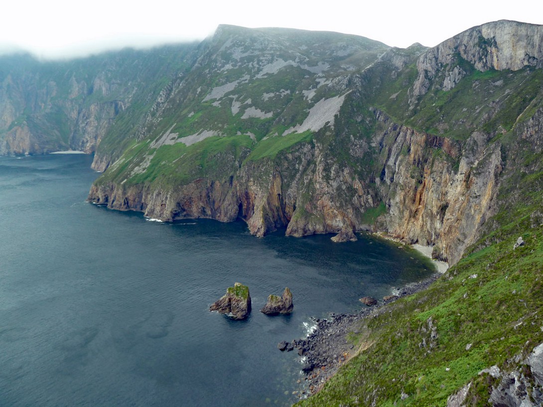 In Carrick müssen wir in kleinere Busse umsteigen, die die steile und enge Straße nach Slieve League hochfahren dürfen. Leider regnet es ziemlich. Als wir nach 20 Minuten oben ankommen, zischt uns ein gewaltiger Wind um die Ohren, der keinen Regenschutz mit einem Schirm zulässt. Also schnüren wir unseren Anorak ganz eng und versuchen, nicht von den steilen Klippen geweht zu werden. Die Sicht ist miserabel und ich muss dauernd die Kamera unter dem Anorak verstecken, weil das Objektiv nass wird).